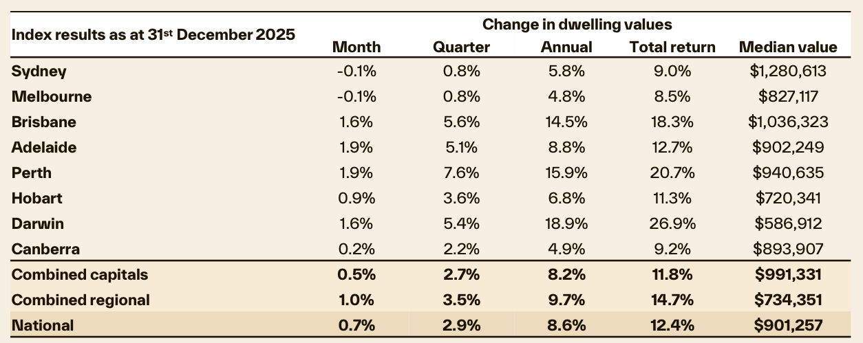 Property data firm Cotality has released its latest research on Australia’s housing market, reporting the strongest calendar-year gain in home values since 2021.